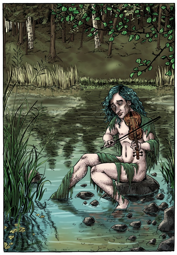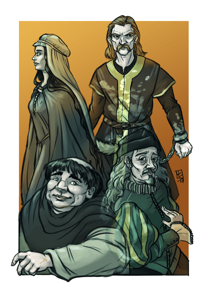 - Handdrawn black linework on paper and digital colours